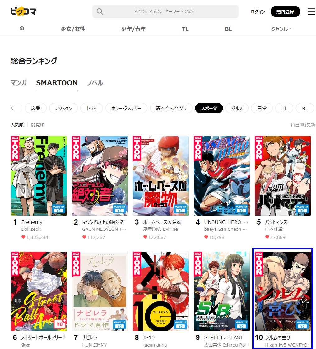 스포츠분야 랭킹_10위 (순위열람은 가능 / 단, 웹툰은 한국에서 접속불가)