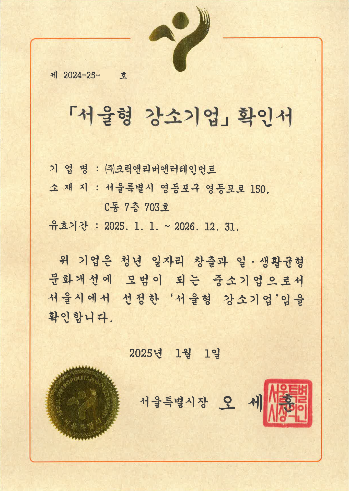 (주)크릭앤리버엔터테인먼트(대표 김민철)가 서울시에서 주관하는 ‘2025년 서울형 강소기업’으로 선정되었습니다.