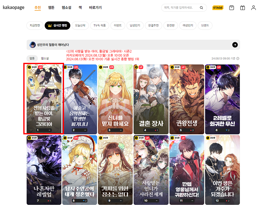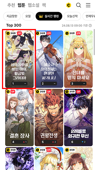 웹툰웹툰 <신의 사랑을 받는 아이, 황금빛 그라티아> 시즌2 종합 랭킹 1위