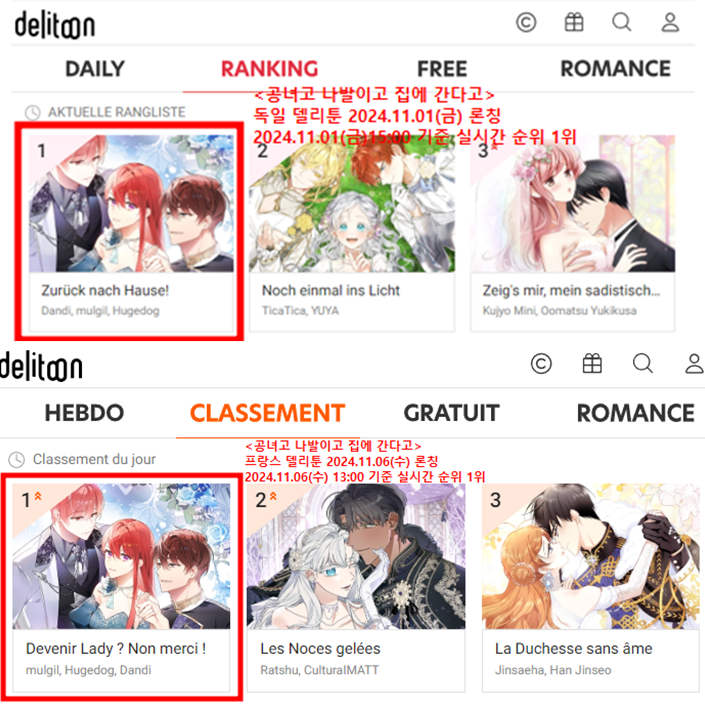 독일,프랑스 델리툰 론칭 <공녀고 나발이고 집에 간다고> 랭킹 1위