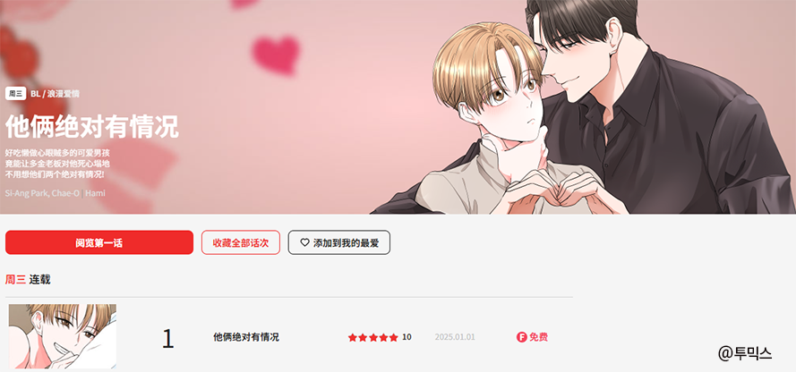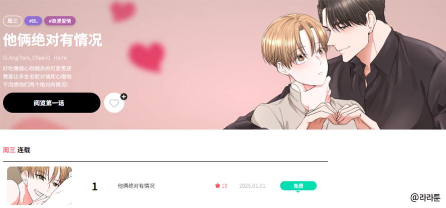 웹툰 <둘이 잤네 잤어> 중국 라라툰과 투믹스 동시 론칭!