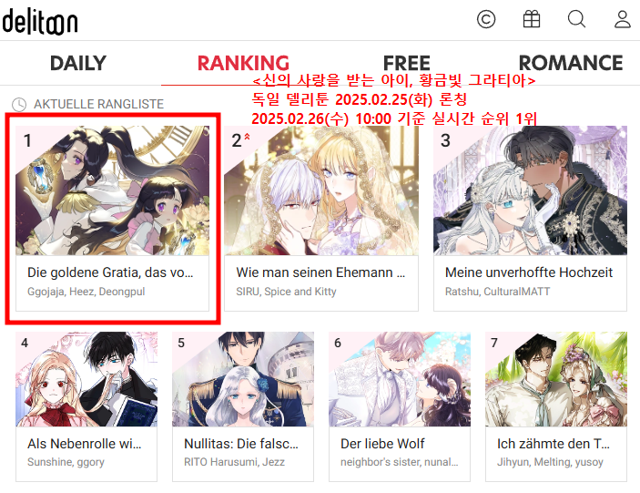 독일 델리툰 랭킹 1위를 차지하며 좋은 반응을 얻고 있습니다 (2025.02.26 10:00 기준)